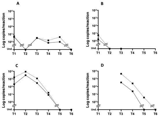 Time course of OROV g- and ag-RNA levels in longitudinally collected clinical samples. OROV g- (continuous line) and ag-RNA (dashed line) levels established by ddPCR: (A) g- and ag-RNA in whole blood; (B) g- and ag-RNA in serum; (C) g- and ag-RNA in urine; (D) g- and ag-RNA in semen. The results are expressed as copies/reaction. Und: undetectable. Double lines indicate a break in the continuity of the values on the axis.