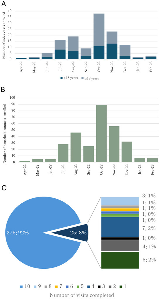 Enrollment of dengue index cases (A) and their household contacts (B), and the study completion rate for the household contacts (C). Study completion is defined as the successful collection of the scheduled blood samples and associated epidemiological data at each visit. The number of visits corresponds to the total completed by each study participant.