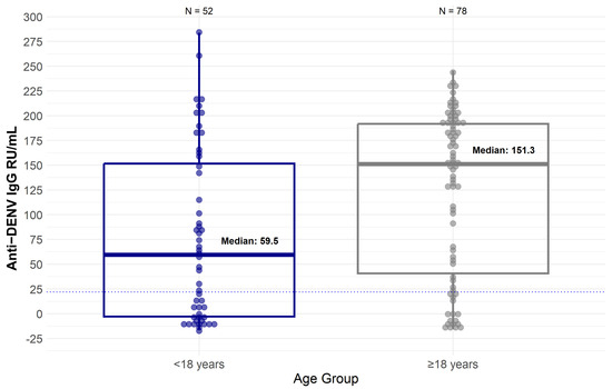The median age of the enrolled ICs was 23 years (IQR: 11–34), 10 years (IQR: 8–14) among the ICs < 18 years of age, and 31 years (IQR: 25–39) among ICs ≥ 18 years of age. Furthermore, 53.1% (69/130) of the ICs were male (Table 1). At enrollment, anti-DENV IgG titers were negative for 37 ICs (28.5%), indicating that those ICs had a primary DENV infection. Proportionally, more primary DENV infections were observed in the ICs < 18 years of age (21/52 (40.4%)) when compared to the ICs ≥ 18 years of age (16/78 (20.5%)) (Table 1). The remaining 93 ICs (71.5%) were anti-DENV IgG-positive at enrollment (post-primary DENV infections). At baseline, ICs < 18 years of age had a median anti-DENV IgG level of 59.5 RU/mL (IQR: −3.5 to 154.4), while those ≥18 years of age had a median of 151.3 RU/mL (IQR: 37.8 to 191.8) (Figure 2).