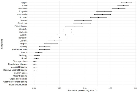 Baseline symptom proportions of index cases with 95% confidence intervals. Bold lettering indicates symptoms associated with dengue with warning signs (DWWS) and severe dengue (SD).