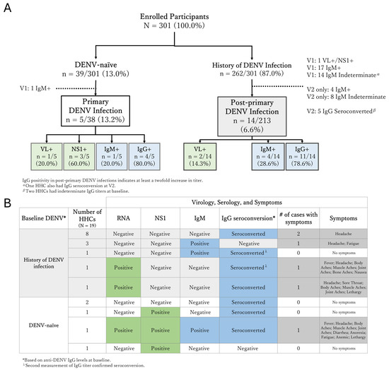 Flowchart of the immunological profiles and viral markers of household contacts (A), and table of DENV-positive cases (B). Virological positive cases are shown in green, and serological positive cases in blue.