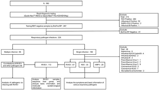 Data procedures. During the study period, we collected samples from 582 patients, and after RDT, 267 patients with negative RDT results participated in the study. We used multiplex PCR to examine the samples of these patients with negative RDT results, and a total of 299 pathogen infections were detected, of which 160 were single-pathogen infections and 66 were multiple-pathogen infections. We analyzed the symptoms and basic information of patients with single-pathogen infection. For patients with multiple infections, we analyzed the types of pathogens co-infected with RVs/EVs. In addition, we found that among all infected people, the number of patients infected with RVs/EVs was the largest, so we further analyzed the samples of patients infected with RVs/EVs.