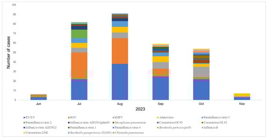 Epidemic curve of acute respiratory infections (ARIs) in Myanmar by month. We plotted the epidemic curve by month, which shows that the number of detected cases increased significantly from June, peaked in August, and then gradually decreased. RV/EV, RSV, and hMPV were most detected in August. Other pathogens, such as adenovirus, parainfluenza virus (types 1–4), Mycoplasma pneumoniae, and influenza A (H1N1) virus (pdm09), were also active from July to October.