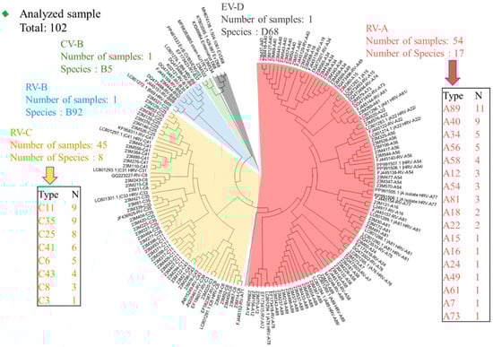In this study, RV-A was the most diverse species, encompassing 17 different types: RV-A7, A12, A15, A16, A18, A22, A24, A34, A40, A49, A54, A56, A58, A61, A73, A81, and A89 (Figure 3). Among these, the most prevalent genotypes were RV-A89 (11 cases), RV-A40 (9 cases), RV-A34 (5 cases), and RV-A20 (5 cases) (Table S4). Within the RV-B group, a single instance of RV-B5 was identified. Eight types of RV-C were observed for RV-C3, C6, C8, C11, C25, C35, C41, and C43. Among these, RV-C11 (nine cases), RV-C35 (nine cases), and RV-C25 (eight cases) were the most prevalent (Table S3). One CV-B (CV-B5) and one EV-D (EV-D68) were also detected within the EV species. A single case of EV-D68 infection was identified in a 9-month-old male outpatient who presented with fever, cough, and dyspnea. Another case involving CV-B5 infection was detected in a 4.6-year-old male outpatient whose symptoms included fever, cough, and rhinorrhea.