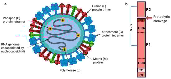 HNVs are enveloped, negative-sense, single-stranded RNA viruses with genomes of approximately 18–20 kb encoding six structural proteins: nucleocapsid (N), phosphoprotein (P), matrix protein (M), fusion protein (F), attachment glycoprotein (G), and large polymerase (L) [] (Figure 1a). The entry of HNVs into host cells is mediated by two surface glycoproteins: the attachment glycoprotein (G) tetramers and the fusion protein (F) trimers []. The G protein is responsible for binding to host cell receptors, which, for HeV and NiV, are primarily ephrin-B2 and ephrin-B3 [,,]. These are highly conserved proteins across mammalian species and contribute to the broad host range of henipaviruses []. The F protein, meanwhile, mediates the fusion of the viral and host cell membranes, allowing the viral ribonucleocapsid (RNP) to enter the cytoplasm and initiate infection.