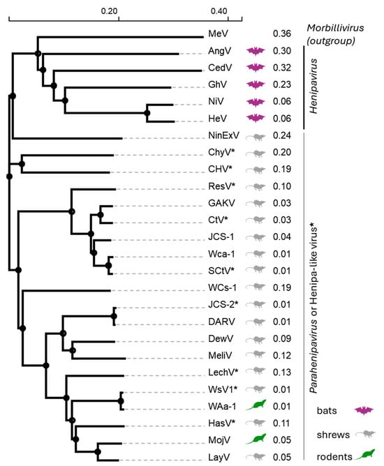 Phylogenetic relationships of Henipaviruses, Parahenipaviruses, and henipa-like viruses based on their F proteins. Amino acid sequences corresponding to putative F proteins were aligned using ClustalOMEGA (Version 1.2.2) [], with the resulting phylogenetic tree generated using the Neighbor-Joining method. The optimal tree is shown. The percentage of replicate trees in which the associated taxa clustered together in the bootstrap test (1000 replicates) are shown next to the branches. GenBank accession numbers are indicated in Table 1. Viruses marked with a * have not been formally classified and are considered henipa-like viruses. Measles virus (MeV, NP_056922.1), Angavokely virus (AngV), Cedar virus (CedV), Ghana virus (GhV), Nipah virus (NiV), Hendra virus (HeV), Ninorex virus (NinExV), Chodsigoa hypsibia henipavirus (ChyV), Camp Hill virus (CHV), Resua virus (ResV), Gamak virus (GAKV), Crocidura tanakae henipavirus (CtV), Jingmen Crocidura shantungensis henipavirus 1 (JCS-1), Wufeng Crocidura attenuata henipavirus 1 (Wca-1), Shiyan Crocidura tanakae henipavirus (SCtV), Wufeng Chodsigoa smithii henipavirus 1 (WCs-1), Jingmen Crocidura shantungensis henipavirus 2 (JCS-2), Daeryong virus (DARV), Denwin virus (DewV), Melian virus (MelV), Lechcodon virus (LechV), Wenzhou shrew henipavirus 1 (WsV1), Wenzhou Apodemus agrarius henipavirus 1 (WAa-1), Hasua virus (HasV), Mojiang virus (MojV), and Langya virus (LayV).