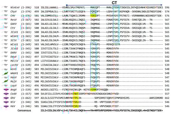 Tyr-based endocytic motifs and putative endocytic signals in the HNV F cytoplasmic tail. Sequence alignment of henipavirus F-CT residues was performed using ClustalOMEGA []. All Tyr residues are highlighted in red. Location of canonical endocytic motifs of the form YXXØ (where X is any amino acid and Ø is an amino acid with a bulky hydrophobic sidechain) is indicated by yellow highlights. Putative, non-canonical, Tyr-based endocytic signals are indicated with a blue box. CT, cytoplasmic tail. The first charged residue, which signals the end of the transmembrane region, is indicated in bold font. Black-dash lines indicate regions lacking alignment. Bat, rodent, and shrew reservoirs are denoted by the same symbols as in Figure 3. GenBank accession numbers are indicated in Table 1. Ninorex virus (NinExV), Chodsigoa hypsibia henipavirus (ChyV), Camp Hill virus (CHV), Resua virus (ResV), Gamak virus (GAKV), Crocidura tanakae henipavirus (CtV), Jingmen Crocidura shantungensis henipavirus 1 (JCS-1), Wufeng Crocidura attenuata henipavirus 1 (Wca-1), Shiyan Crocidura tanakae henipavirus (SCtV), Wufeng Chodsigoa smithii henipavirus 1 (WCs-1), Jingmen Crocidura shantungensis henipavirus 2 (JCS-2), Daeryong virus (DARV), Denwin virus (DewV), Melian virus (MelV), Lechcodon virus (LechV), Wenzhou shrew henipavirus 1 (WsV1), Wenzhou Apodemus agrarius henipavirus 1 (WAa-1), Hasua virus (HasV), Mojiang virus (MojV), Langya virus (LayV), Angavokely virus (AngV), Cedar virus (CedV), Ghana virus (GhV), Nipah virus (NiV), and Hendra virus (HeV).