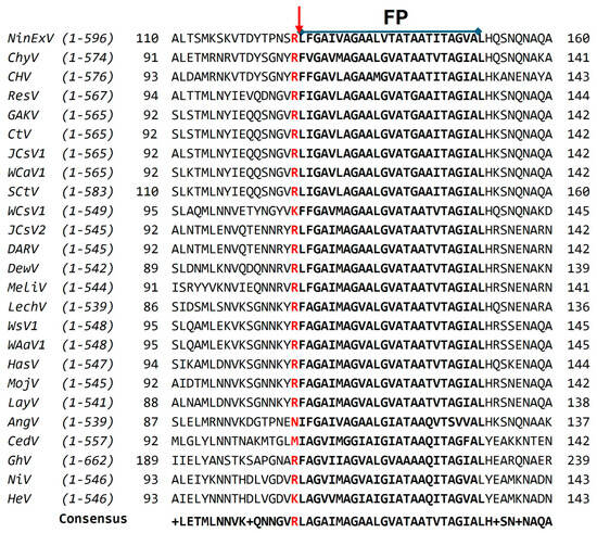 F1-F2 cleavage site of HeV and NiV and the predicted cleavage sites of the other Henipaviruses, Parahenipaviruses, and henipa-like viruses. Sequence alignment of HNV F protein residues was performed using ClustalOMEGA []. The residue after which cleavage occurs, or is predicted to occur, is indicated in red. Arrow indicates cleavage site. FP, fusion peptide. Known or predicted FP residues are indicated in bold font. GenBank accession numbers are indicated in Table 1. Ninorex virus (NinExV), Chodsigoa hypsibia henipavirus (ChyV), Camp Hill virus (CHV), Resua virus (ResV), Gamak virus (GAKV), Crocidura tanakae henipavirus (CtV), Jingmen Crocidura shantungensis henipavirus 1 (JCS-1), Wufeng Crocidura attenuata henipavirus 1 (Wca-1), Shiyan Crocidura tanakae henipavirus (SCtV), Wufeng Chodsigoa smithii henipavirus 1 (WCs-1), Jingmen Crocidura shantungensis henipavirus 2 (JCS-2), Daeryong virus (DARV), Denwin virus (DewV), Melian virus (MelV), Lechcodon virus (LechV), Wenzhou shrew henipavirus 1 (WsV1), Wenzhou Apodemus agrarius henipavirus 1 (WAa-1), Hasua virus (HasV), Mojiang virus (MojV), Langya virus (LayV), Angavokely virus (AngV), Cedar virus (CedV), Ghana virus (GhV), Nipah virus (NiV), and Hendra virus (HeV).