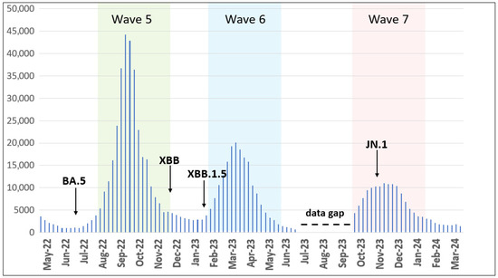 We analyzed retrieved epidemiological data for COVID-19 cases between May 2022 and March 2024 and observed the following distinct epidemic waves in Ukraine. Wave 5 occurred from August to November 2022, Wave 6 from February to May 2023, and Wave 7 from October 2023 to January 2024 (Figure 1).