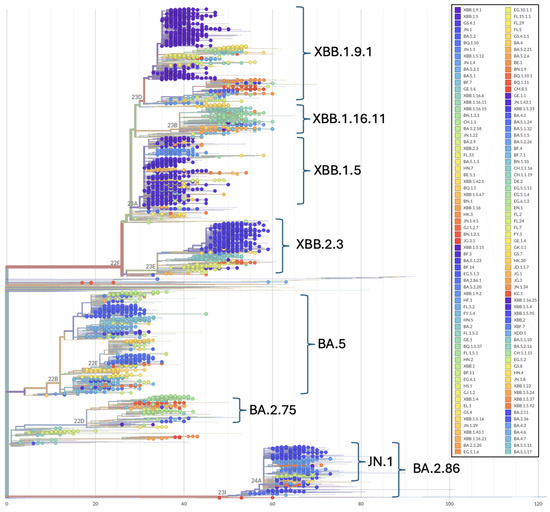 The monthly lineage distribution of 3598 samples was analyzed using metadata downloaded from GISAID. Calculations in percentage relative to the total number of samples were determined for the following lineages per PANGO nomenclature: BA.1; BA.2, excluding BA.2.75, BA.2.86, BA.2.75; BA.2.86 excluding JN.1, JN.1.; JN.1; BA.4; BA.5; XBB excluding XBB.1.5, EG.5; XBB.1.5; EG.5; and other recombinants (Supplementary Table S1). The reported lineages were selected based on the VOC/VOI status designated by the WHO based on their assessed potential (1) for expansion and replacement of prior variants, (2) for causing new waves with increased circulation, and (3) for the need for adjustments to public health actions [20].