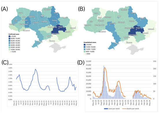 A total of 712,072 confirmed cases of COVID-19 were reported in Ukraine during May 2022–March 2024. Among others, the Dnipropetrovsk oblast reported the highest number of cases at 73,291 (10.3% of the total), followed by Kyiv city with 54,838 cases (7.7%) (Figure 5A), which is consistent with the current dense population in these areas. Central and northern regions, such as Kyiv and Zhytomyr oblasts, reported moderate numbers, with 36,288 cases (5.1%) and 36,050 cases (5.1%), respectively. In contrast, frontline regions like Luhansk, Kherson, and Donetsk oblasts reported substantially fewer confirmed cases due to war-related disruptions. The Luhansk oblast recorded only 3 cases (0.0%), while Kherson and Donetsk oblasts reported 1917 cases (0.3%) and 14,511 cases (2.0%), respectively. Due to the Russian occupation, no health records were submitted to Ukraine from the Luhansk oblast after February 2022. Western oblasts such as Lviv and Khmelnytskyi reported 34,083 cases (4.8%) and 44,406 cases (6.2%), respectively, reflecting the impact of internally displaced populations and comparatively more stable healthcare systems (Figure 5A).
