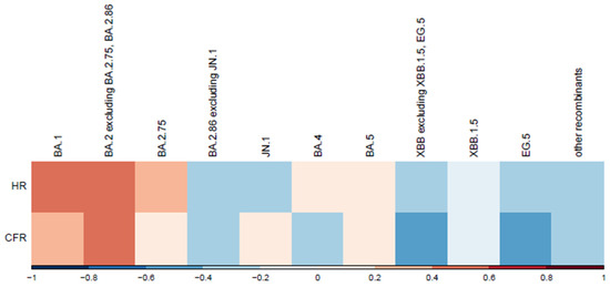 Correlation between variants and normalized severity metrics. This heatmap illustrates the correlation between SARS-CoV-2 variants and two normalized severity metrics: hospitalization rate (HR) and Case Fatality Rate (CFR) per 100 cases. SARS-CoV-2 variants are displayed chronologically. Correlation coefficients are represented along the x-axis, with red indicating positive correlations (stronger associations with increased severity) and blue showing negative correlations (weaker associations or reduced severity).