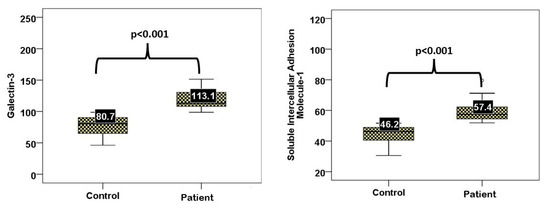 Serum sICAM-1 and galectin-3 levels in patients versus controls.