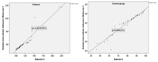 A very strong and statistically significant positive correlation was observed between the serum sICAM-1 and galectin-3 levels (r = 0.954, p < 0.001). Mild positive correlations were also identified between both biomarkers and triglyceride levels (sICAM-1: r = 0.373, p = 0.012; galectin-3: r = 0.400, p = 0.006). The same strong correlation between sICAM-1 and galectin-3 was confirmed in both the patient and control groups (Figure 3).