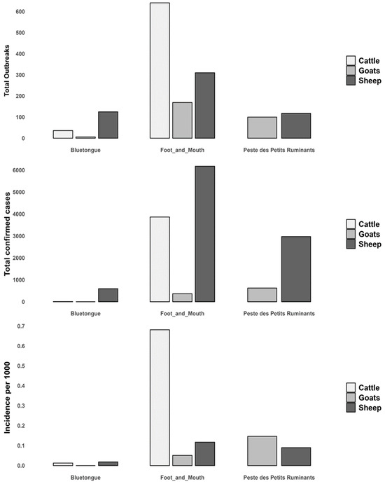 The total number of cases recorded was 10,403 (with an incidence rate of 0.16 per 1000 animals) for FMD, 609 (0.018) for BT, and 3597 (0.096) for PPR. Cattle were most affected by FMD (0.68), sheep by BT (0.018), and goats by PPR (0.15) (Figure 2).