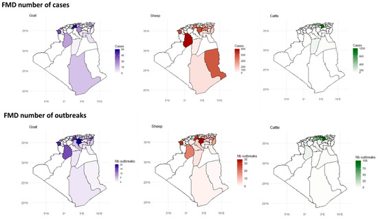Spatial distribution of confirmed FMD cases and outbreaks in goats, sheep, and cattle across Algeria. Wilayas with no cases or outbreaks are shaded in white. Discrepancies in Wilayas with outbreaks reported and confirmed cases relate to outbreaks where laboratory confirmation was positive for the species in the area. See also Figures S1–S3.