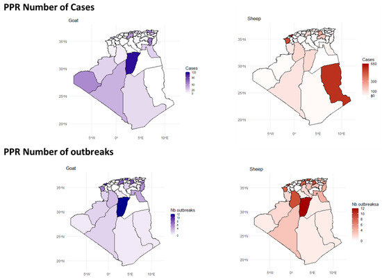 PPR patterns indicate significant regional variations, with higher PPR activity observed in the north and north-Saharan regions among sheep, and a predominant impact in north-Saharan regions (Ghardaïa) among goats (Figure 6).