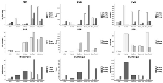 Bar charts illustrating the number of confirmed cases, number of outbreaks, and incidence rates of FMD, Bluetongue, and PPR in three livestock species: cattle, goats, and sheep. The data are categorized across various bioclimatic zones, highlighting the relationship between the distribution of the diseases and environmental conditions.