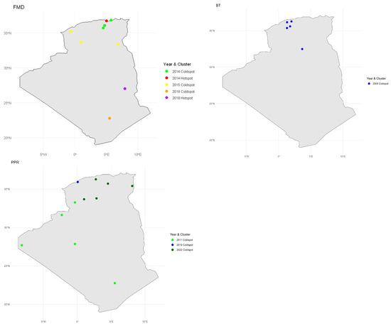 Spatial distribution of FMD, BT, and PPR incidence rates in Algeria: Identification of hotspot and coldspot clusters.