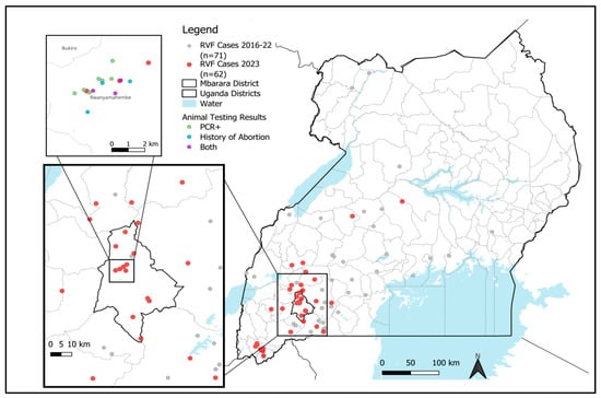 A map of Uganda showing the location of the 2023 Mbarara RVF outbreak and laboratory-confirmed relative to historic RVFV cases.
