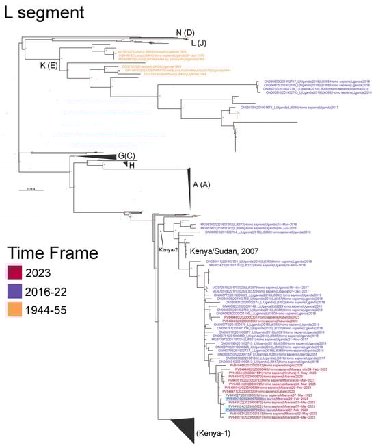 Phylogenetic analysis of the L segment of the Rift Valley Fever virus sequences in Uganda across different time frames (1944–2023). Sequences collected from Uganda are labeled, with sequence names color-coded by their collection timeframe. Blue shading highlights RVFV sequences collected from cattle. Notably, sequences from humans and cattle during the Mbarara outbreak and surrounding regions were closely related, suggesting zoonotic transmission. Bootstrap support values greater than 70% are labeled in red at internal nodes. Major clades are labeled according to Grobbalaar et al. (2011) [] and Samy et al. (2017) [], and the scale bar is in units of substitutions/site.