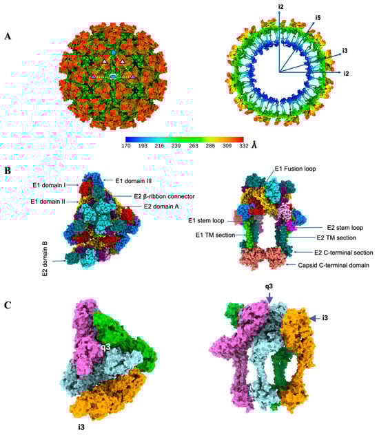 - Cao, D.; Ma, B.; Cao, Z.; Zhang, X.; Xiang, Y. Structure of Semliki Forest virus in complex with its receptor VLDLR. Cell 2023, 186, 2208–2218.e15. [Google Scholar] [CrossRef] [PubMed]