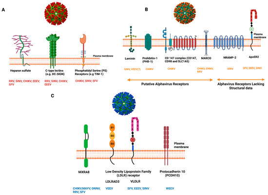 - Zimmerman, O.; Holmes, A.C.; Kafai, N.M.; Adams, L.J.; Diamond, M.S. Entry receptors—The gateway to alphavirus infection. J. Clin. Investig. 2023, 133, e165307. [Google Scholar] [CrossRef] [PubMed]