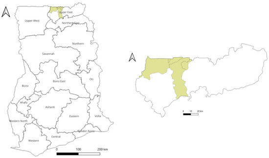 Map of Ghana (on the left) showing the Kassena-Nankana Municipality in the Upper East Region (on the right).