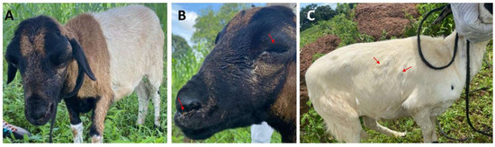 Clinical signs observed in suspected sheep from a farm in Vunania. (A) lethargic sheep; (B) sheep with swollen eyes and oculonasal discharges; (C) generalized pox-like lesions on the sheep (red arrows).