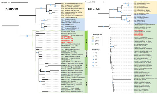 Maximum-likelihood phylogenetic trees of Capripoxviruses (CaPV) with SPVs from Ghana based on (A) complete RPO30 gene sequences, applying the HKY model and gamma-rate distributions, and (B) complete GPCR gene sequences, applying the GTR model and gamma-rate distributions. The trees are visualized in iTOL with SPVs from Ghana (in red). Note: Previous abbreviations (i.e., SPPV and GTPV) have been used in the sequence names.
