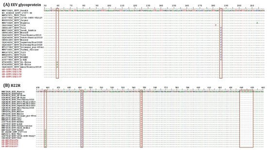 Multiple sequence alignment of (A) EEV glycoprotein gene and (B) B22R gene. Ghana SPV sequences (in red) were aligned with representative SPV sequences retrieved from GenBank for each gene. The main SNPs and deletions in the alignment are shown in the blocks. The dots indicate identical nucleotides in the alignment. Note: The previous abbreviation (i.e., SPPV) has been used in the sequence names.