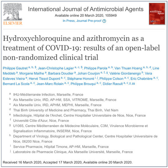 - Gautret, P.; Lagier, J.C.; Parola, P.; Hoang, V.T.; Meddeb, L.; Mailhe, M.; Doudier, B.; Courjon, J.; Giordanengo, V.; Vieira, V.E.; et al. RETRACTED: Hydroxychloroquine and azithromycin as a treatment of COVID-19: Results of an open-label non-randomized clinical trial. Int. J. Antimicrob. Agents 2020, 56, 105949. [Google Scholar] [CrossRef]
