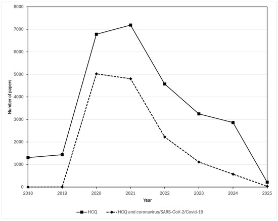 Comparison of the number of publications in the Scopus database about hydroxychloroquine and those about both hydroxychloroquine and coronavirus/SARS-CoV-2/COVID-19. Publications mentioning hydroxychloroquine were found by searching for (TITLE-ABS-KEY (hydroxychloroquine)) AND (PUBYEAR > 2017). Publications mentioning both hydroxychloroquine and coronavirus/SARS-CoV-2/COVID-19 were found by searching for (TITLE-ABS-KEY (hydroxychloroquine)) AND (TITLE-ABS-KEY (coronavirus OR COVID-19 OR SARS-CoV-1 OR SARS-CoV-2)) AND (PUBYEAR > 2017)).