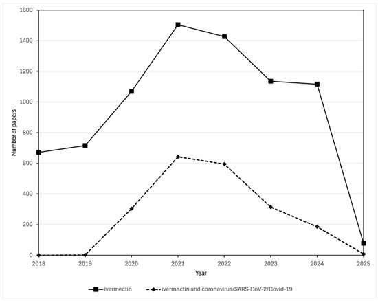 Comparison of the number of publications in the Scopus database about ivermectin and those about both ivermectin and coronavirus/SARS-CoV-2/COVID-19. Publications mentioning ivermectin were found by searching for (TITLE-ABS-KEY (ivermectin OR ivomec OR mectizan OR stromectol)) AND (PUBYEAR > 2017). Publications mentioning both ivermectin and coronavirus/SARS-CoV-2/COVID-19 papers were found by searching for (TITLE-ABS-KEY (ivermectin OR ivomec OR mectizan OR stromectol)) AND (TITLE-ABS-KEY (coronavirus OR COVID-19 OR SARS-CoV-1 OR SARS-CoV-2)) AND (PUBYEAR > 2017)).