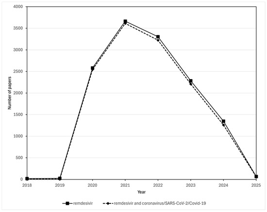 Despite, or perhaps because of, the uncertainty of its potential, the surge in studies about remdesivir that were published over the course of the pandemic almost seems to have focused almost entirely on its role in treating COVID-19. Scopus data show that the yearly number of publications discussing both remdesivir and SARS-CoV-2 throughout the period 2018–2025 were essentially the same as those discussing remdesivir alone (Figure 4). Whatever the benefits of remdesivir in treating COVID-19 might be, the political as opposed to popular nature of its support among regulatory bodies, combined with its cost of nearly $3000 for a 5-day treatment being covered for those with a USA government insurance plan, prompted Bharti and Sismondo [12] to describe it as the “establishment drug” for the treatment of COVID-19. As a result of the results of the EPIC-HR trial PaxlovidR, an orally effective combination of two anti-viral protease inhibitors, the SARS-CoV-2 inhibitor nirmatrelvir plus the HIV-protease inhibitor ritonavir, became the preferred drug treatment for outpatients with benefits shown when taken with 3 days of infection. Paxlovid also saw extensive use in hospitalized patients with COVID-19 [111,112]. Paxlovid was granted Emergency Use Authorization in the USA on 25 May 2023. The EPIC-HR (Evaluation of Protease Inhibition for COVID-19 in High-Risk Patients), was a randomized, double-blinded study of non-hospitalized adult patients with confirmed SARS-CoV-2 who were at high risk of progressing to severe COVID-19. The study compared data from 2246 adults in North and South America, Europe, Africa, and Asia with the data released by Pfizer on 14 December 2021 [113].
