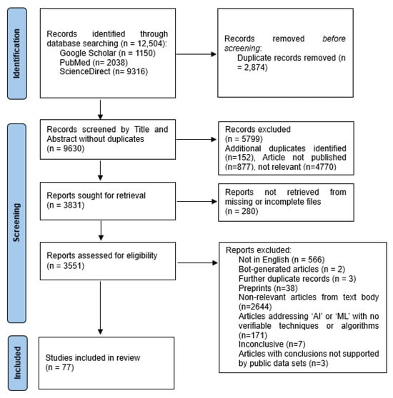 We included the literature published from 1 January 2020 to 9 April 2024. Literature types included journal articles, books and their sub-chapters, conference proceedings, peer-reviewed commentary papers, and perspective articles. Records were identified through Google Scholar, PubMed, and ScienceDirect. The original database search resulted in 1150 records from Google Scholar, 2038 from PubMed, and 9316 from ScienceDirect. From the records, 2867 were related to public health and surveillance, 6492 were related to clinical diagnosis, and 3145 were related to clinical prognosis. After removing duplicates, the remaining 9630 records were screened. The exclusion criteria were (1) articles not written in English; (2) bot-generated articles; (3) duplicate records; (4) non-peer-reviewed articles or preprints; (5) non-relevant articles; (6) articles addressing ‘AI’ and ‘ML’ with no concrete evidence of techniques or algorithms that could be verified; (7) inconclusive articles; and (8) articles with conclusions not directly supported by publicly available datasets.