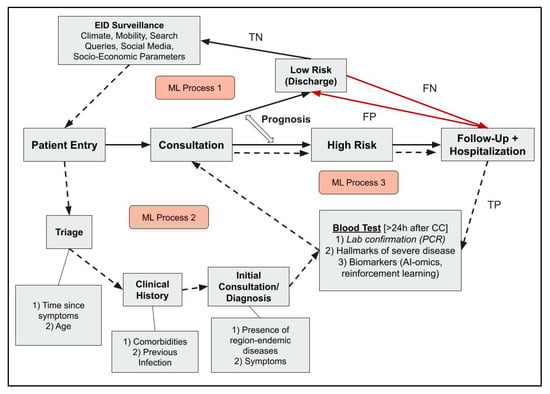 Flowchart demonstrating the patient trajectory of a typical infectious disease profile. ML can be potentially employed in surveillance (process 1), diagnosis (process 2), and prognosis (process 3) to facilitate and accelerate these processes, which will be critical particularly during a virus pandemic or epidemic. Solid lines represent the shortened patient trajectory in response to an infectious disease pandemic, which can be facilitated with the implementation of ML or AI; dotted lines represent an ideal patient trajectory, and host of potential parameters can be leveraged by ML; red lines represent potential treatment burdens on the hospital infrastructure during a pandemic. FN, False Negative; TN, True Negative; FP, False Positive; TP, True Positive; ML, machine learning; CC, Chief Complaint; PCR, Polymerase Chain Reaction; EIDs, Emerging Infectious Diseases.