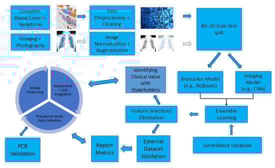 Process 2 involves triage and diagnosis, where an informed diagnosis is made after obtaining information from clinical history, symptoms, and blood tests. The role of ML is to integrate the data obtained from the triage process, demographic parameters, clinical history, and diagnosis to predict the risk classification of patient cases. The nature of retrospective data collection and posteriori knowledge generation is a data-driven process that provides an informed interpretation to the clinician to guide diagnosis. Dimensionality reduction in ML extracts key features relevant to the disease. Better algorithms in ML and deep learning result in a significant decrease in the complexity of analysis, reducing the running time and the need for manual programming to map clinical signs to diagnoses [19,58]. These processes facilitate streamlining workflow, reducing clinician error in decision-making.