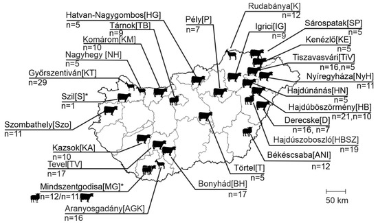 Figure 1. Geographical locations of investigated farms and farm identifications [IDs] in Hungary, as well as the number of collected enteric samples (n = x). Animal species are marked with silhouettes. *: Localization of index farms from where the samples used for next-generation sequencing originated.