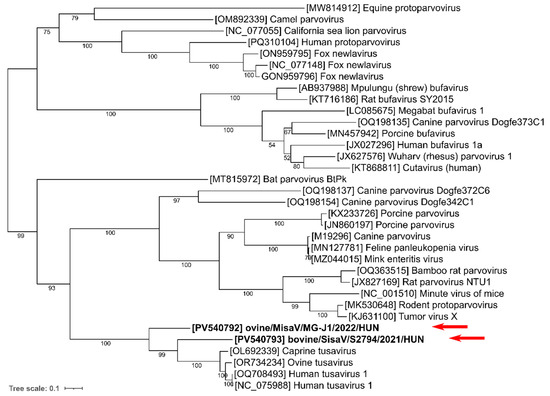 Figure 3. Phylogenetic relationship of the study viruses (marked with bold and red arrows), most closely related tusaviruses and representative members of the subfamily Parvovirinae, based on the amino acid sequences of the NS1 protein. The tree was generated by the maximum likelihood method with an LG + F + I + G4 model with 1000 bootstrap (BS) replicates with IQTree, visualized with iTOL. Only BS values of 50 or more are indicated at the nodes.