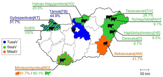 Figure 5. Geographical locations of misavirus (MisaV, orange), sisavirus (SisaV, green) and tusavirus (TusaV, blue) positive farms with overall prevalences. Counties with positive farms were also color-coded according to the viruses (see legend on the figure). Note that dual color patterns (e.g., blue-green or orange-green) indicate the presence of two viruses in that county.
