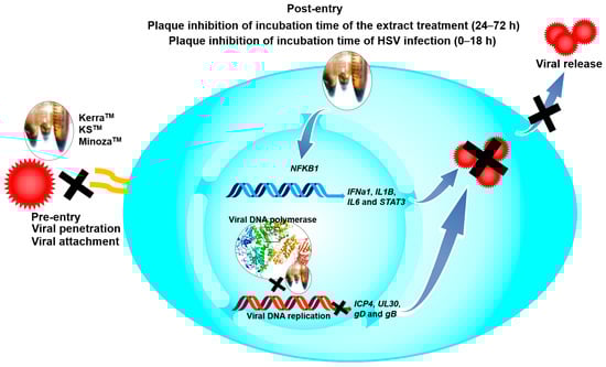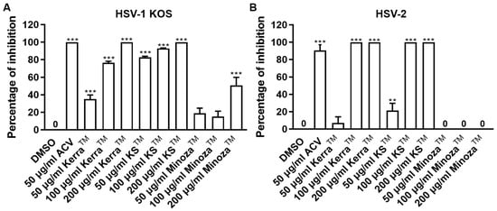 3.2. KerraTM, KSTM, and MinozaTM Significantly Inhibited the Infection with HSV-1 and HSV-2 Wild-Type Strains in the Post-Entry Step