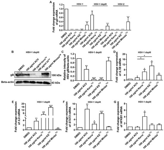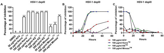 3.3. KerraTM, KSTM, and MinozaTM Significantly Inhibited HSV-1 dxpIII in the Post-Entry Step
