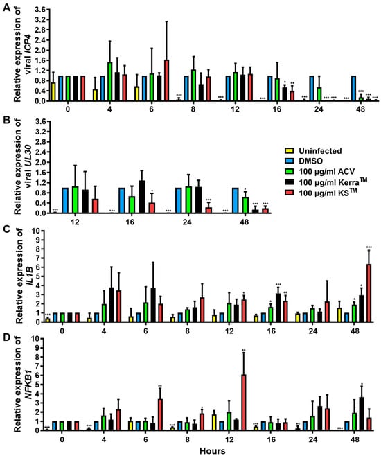 3.7. Effect of KerraTM and KSTM on Immediate Early Gene ICP4, Early Gene UL30, IL1B, and NFKB1 at Different Time Points