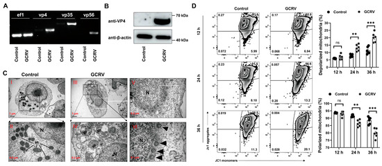 Previous studies have shown that GCRV-II is capable of infecting PBLs and Mo/Mφs in vitro [4,10]. In addition, the GCRV-II outer capsid protein VP4 has been demonstrated to induce MMP depolarization, resulting in mitochondrial damage and apoptosis in Ctenopharyngodon idella kidney (CIK) cells [9]. To determine the potential of GCRV-II to infect PBLs and induce mitochondrial dysfunction, the PBLs were isolated and cultured in serum-free medium and exposed to GCRV-II for 4 h to facilitate viral invasion, after which they were cultured in an FBS medium for a further 20 h. Our data show that GCRV-II is able to infect PBLs and complete viral gene (e.g., vp4, vp35, and vp56) replication and viral VP4 protein translation (Figure 1A,B). Using transmission electron microscopy (TEM), we observed that the viral particles were located in the cytoplasm close to the nucleus (Images V and VI in Figure 1C). Notably, we also observed obvious mitochondrial swelling and damage in infected PBLs, accompanied by a marked reduction in their number (Images II and IV in Figure 1C). To further validate the occurrence of mitochondrial dysfunction in the infected PBLs, we assessed the mitochondrial membrane potential using the JC1 probe at 12–36 h post infection. The results showed pronounced mitochondrial dysfunction in infected PBLs, as evidenced by a significantly increased frequency of unhealthy or depolarized mitochondria and a decreased ratio of polarized mitochondria, at 24 and 36 h rather than 12 h post infection (Figure 1D). These results collectively suggest that GCRV-II can directly invade PBLs and induce mitochondrial dysfunction through mitochondrial depolarization.