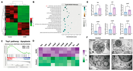 Previous studies have shown that virus-induced mitochondrial depolarization is a clear indicator associated with early apoptosis in infected cells [18,19,30]. To investigate whether GCRV-II infection has an impact on cell survival and cellular immune response, we performed RNA sequencing (RNA-seq) and gene set enrichment analysis (GSEA) in PBLs with or without virus exposure. As shown in Figure 2, the GCRV group showed a completely different gene expression pattern compared to the control group (Figure 2A). Among the top 20 enriched KEGG pathways in the GCRV group, the apoptosis pathway ranked first (Figure 2B,C), with significant upregulation of pro-apoptotic genes (e.g., bax, cytc, apaf1, casp3, casp7, casp8, casp9, casp10, fas, and fadd) (Figure 2D). The qPCR data further confirmed the expression profile (bax, cytc, apaf1, casp3, casp8, and casp9) consistent with mitochondria-mediated intrinsic apoptosis in PBLs (Figure 2E). In addition, the infected PBLs showed typical apoptotic symptoms such as cytoplasmic vacuolization, cell rounding, chromatin condensation, and membrane blebbing, accompanied by obvious mitochondrial damage (Figure 2F). Notably, PBLs in the GCRV group have also shown an obvious antiviral response characterized by the upregulation of interferon-related genes (e.g., IFNγ, IFNα, and IFNβ) (Figure S1B,C), suggesting that viral infection could also activate nucleic acid-mediated cellular defenses through antiviral signaling pathways including TLR-like receptor, JAK-STAT, and cGAS-STING (Figure S1D). The transcriptome and qPCR analysis collectively indicated that GCRV-II infection initiates a mitochondria-dependent apoptosis pathway in infected PBLs.