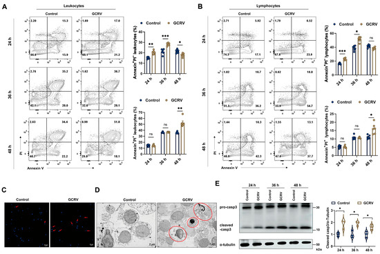 To assess the dynamic changes in the frequency of apoptotic cells, we employed the Annexin V/PI staining assay followed by flow cytometry analysis. In early apoptotic cells, phosphatidylserine (PS) exposure to the outer plasma membrane leaflet could be detected by Annexin V staining, whereas propidium iodide (PI) counterstaining could further distinguish the late apoptotic and necrotic cells. In our study, GCRV-II infection significantly induced apoptosis and necrosis in both blood leukocytes and lymphocytes from 24 to 48 h (Figure 3A,B). However, early apoptosis was predominant in the initial infection (24–36 h), whereas late apoptosis and necrosis were more pronounced in the late phase within 48 h (Figure 3A,B). At 48 h post infection, GCRV-II-infected PBLs exhibited typical apoptotic and necrotic features, including cytoplasmic shrinkage, nuclear chromatin condensation, DNA fragmentation, and membrane blebbing (Figure 3C,D). On the other hand, infected PBLs showed higher protein levels of cleaved caspase-3 at indicated time points (24, 36, and 48 h) after infection (Figure 3E), suggesting that virus-induced apoptosis in PBLs was associated with the activation of the caspase-3 pathway.