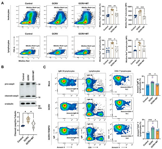 Mitochondria are known as the powerhouses of a cell; they are the most suitable targets of the ROS produced inside a cell [13]. To further investigate whether GCRV-II-induced ROS overproduction was associated with mitochondrial oxidative stress, we examined mitochondrial ROS (mtROS) levels using MitoSox Red staining in both leukocytes and lymphocytes at 24 h post infection. The significantly higher mtROS levels after GCRV-II infection could be observed by analyzing the frequency of MitoSox Red+ cells and the fluorescence intensity of MitoSox Red within the gated leukocyte and lymphocyte populations (Figure 5A). However, GCRV-II-induced mitochondrial ROS was effectively attenuated by pre-treatment with Mito-TEMPO (MT), a mitochondria-targeted antioxidant (Figure 5A). On the other hand, caspase-3-mediated apoptosis in PBLs was significantly enhanced by mtROS overload induced by GCRV-II infection, whereas it was attenuated by mtROS suppression followed by MT treatment (Figure 5B). Notably, we next analyzed apoptosis in gated lymphocytes and found that MT pretreatment can also reduce the apoptotic frequency in both IgM+ B and CD4+ T lymphocytes after exposure to GCRV-II (Figure 5C). Taken together, these results suggest that suppression of mtROS production in infected PBLs could ameliorate the GCRV-II-driven pro-apoptotic effects on bystander B and T lymphocytes.