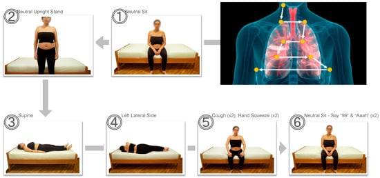 Vibroacoustic data were acquired using a system capable of detecting frequencies from the infrasonic (<20 Hz) to ultrasonic (>20,000 Hz) range. A standardized anterior auscultation protocol was employed, involving nine sequential points positioned to correspond with lung ultrasound zones described by Volpicelli []. At each auscultation site, data were collected for 30 s, with a clinical application providing guidance on body posture, auscultation location, and timing. The procedure was performed through standard hospital gowns. Data were collected across six body posture/position conditions: neutral sitting, neutral upright standing, supine, left lateral decubitus, neutral sitting with cough and hand squeeze, and neutral sitting with vocalizations of “99” and “Aaah” (Figure 1). Acquired vibroacoustic signals were then processed and filtered using dedicated software for subsequent analysis.