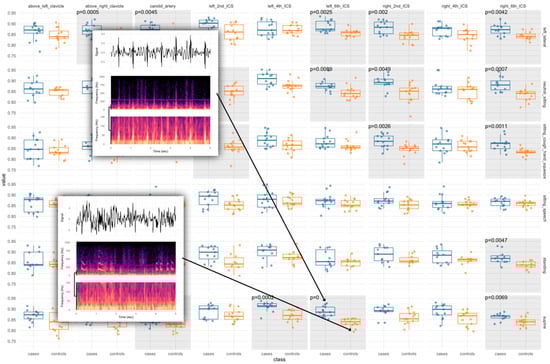 Visual comparisons of Mel-scale based features of spectrograms of matched case–control pair samples. Blue indicates features derived from cases, and orange indicates features from controls. Gray-shadowed regions highlight case-control pair wavelet transform-based Mel-scaled features that were found to be statistically significantly different between the two groups, as determined by ANOVA.